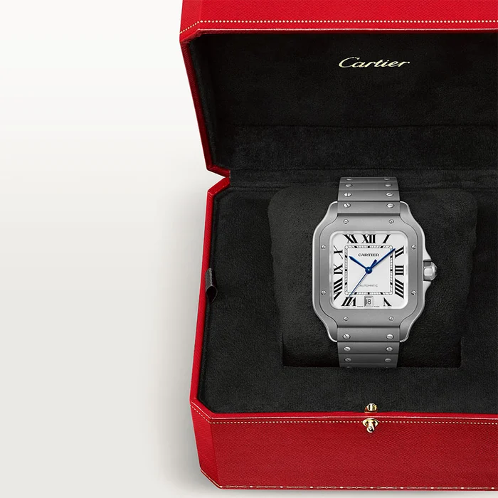 Featuring a sleek silver case paired with a captivating blue dial, this timepiece combines elegance with functionality. The square shape, iconic of the Santos line, is a timeless design that speaks to both tradition and modernity. With its automatic movement, the watch guarantees precision and reliability.