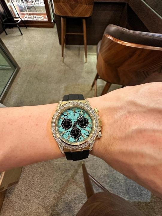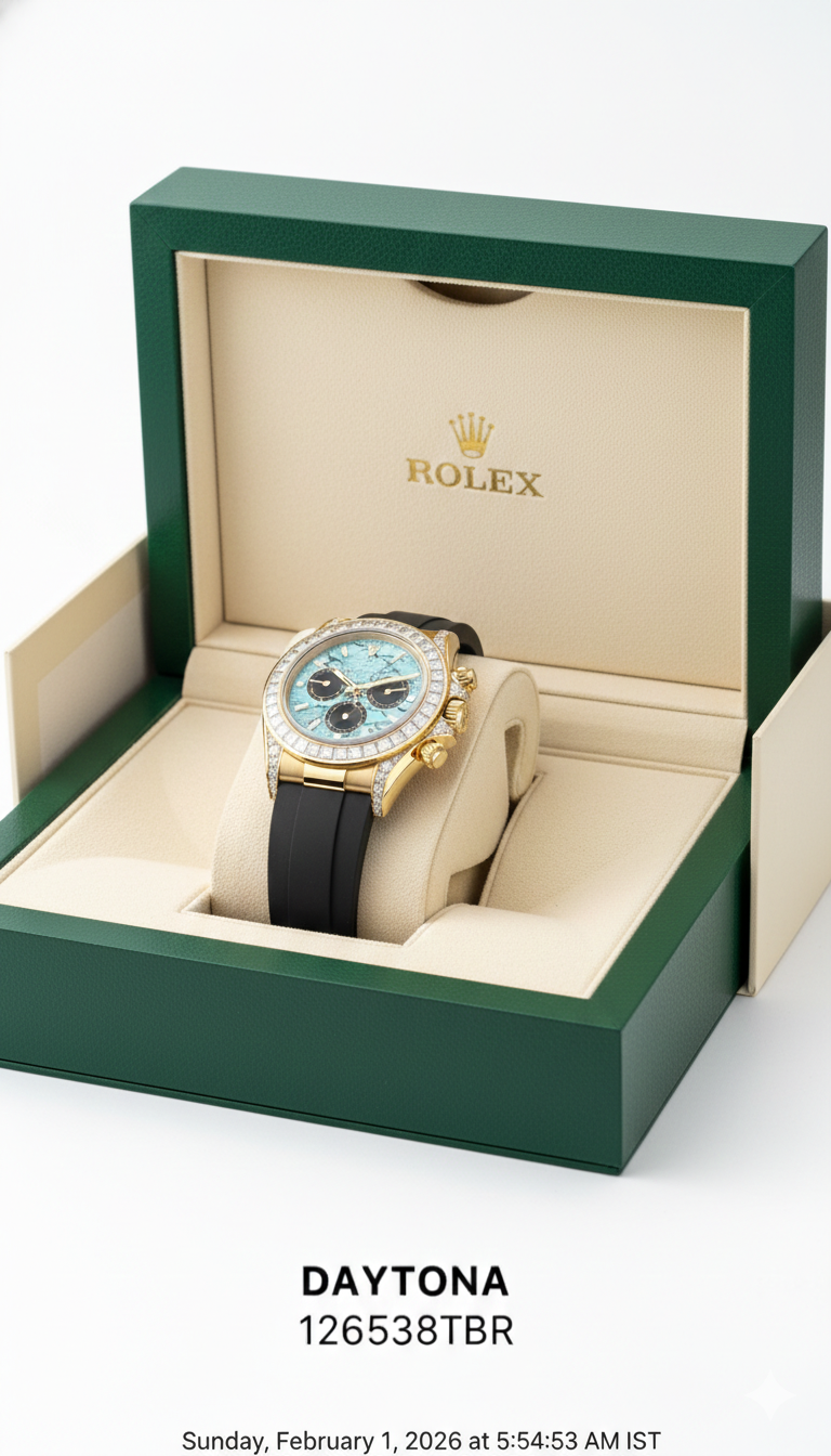 The Rolex Cosmograph Daytona 126538TBR with the turquoise stone dial is a rare, “off-catalog” masterpiece. While standard models appear in the official Rolex brochure, this specific gem-set version is typically reserved for VIP collectors and special requests.